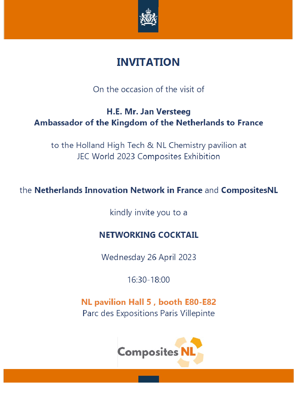 Graag nodigen we u uit om het Holland High Tech Paviljoen op de JEC te bezoeken. Op woensdagmiddag 26 April organiseert The Netherlands Innovation Network in samenwerking met CompositesNL een netwerkborrel en zal de Nederlandse ambassadeur in Frankrijk, Dhr. Jan Versteeg de stand bezoeken.